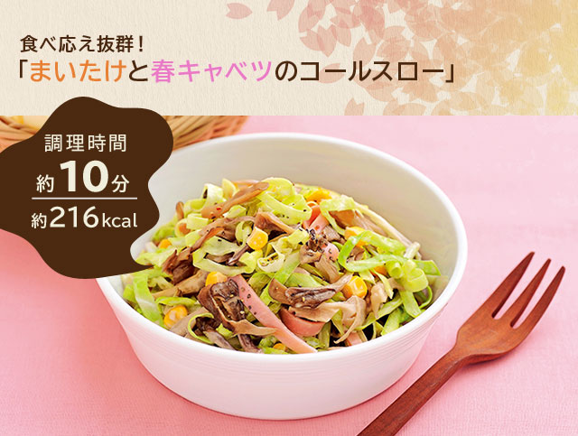 まいたけや春キャベツの素材を活かした、食べ応えあるサラダです。まいたけに含まれている食物繊維は、便通の働きを助け、コレステロールの吸収を抑える働きがあるほか、シミやそばかす、くすみの原因となるメラニン色素を抑制すると言われています。